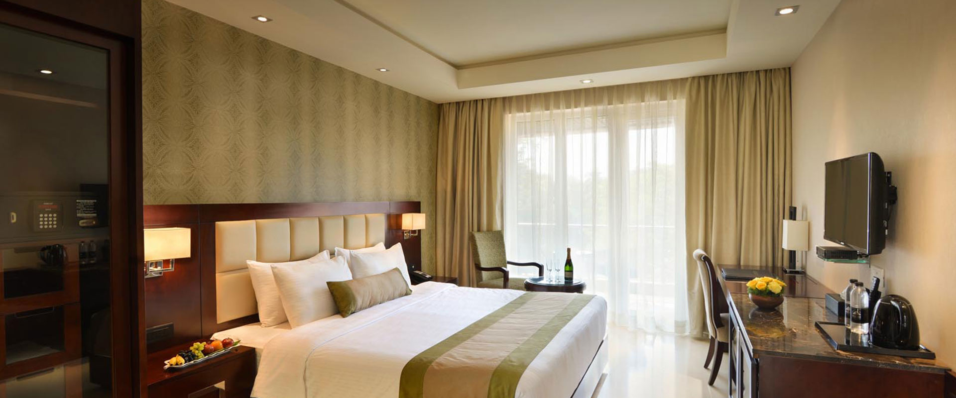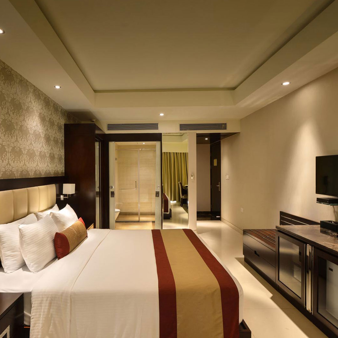 A room of spectacular opulence with plush interiors and a balcony with abundant space. The room boasts of an independent living room with complimentary Wi-Fi, two LCD TVs, hair dryer, safe, iron, tea/coffee maker, a separate work area and bath wear essentials.
