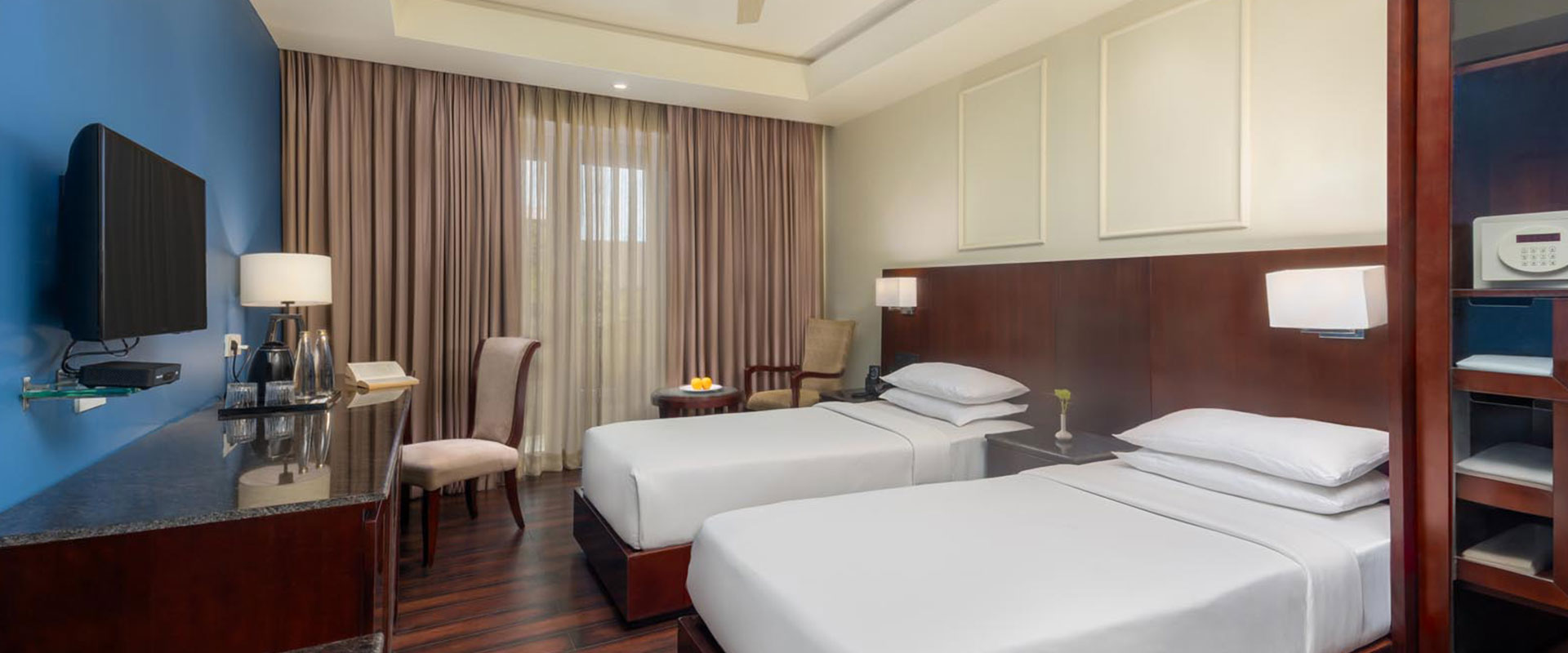 Comfortable and spacious with the choice of either a king-sized bed or twin beds, a separate work area, 32-inch LCD TV, Wi-Fi, hair dryer, safe, iron, tea/coffee maker. Lay back and enjoy a cold beer in the evening or savour a cup of tea early in the morning, right as you may fancy.
